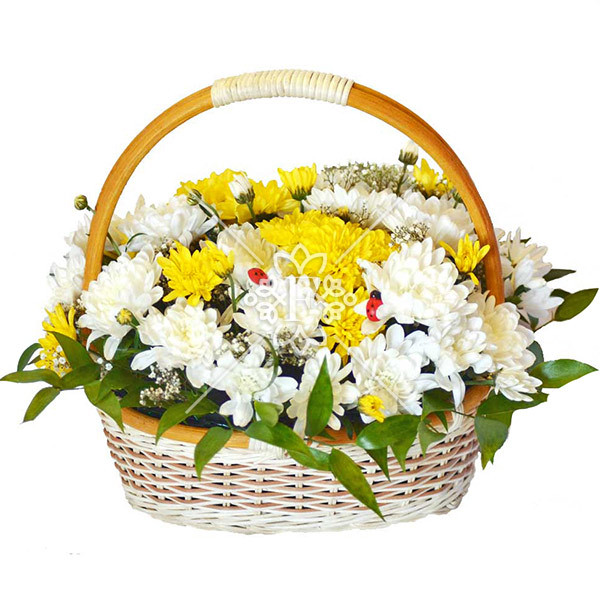 хризантема белая кустовая - 4 шт., хризантема жёлтая кустовая – 3 шт., гипсофила, декоративная зелень, оазис, корзина малая, декор